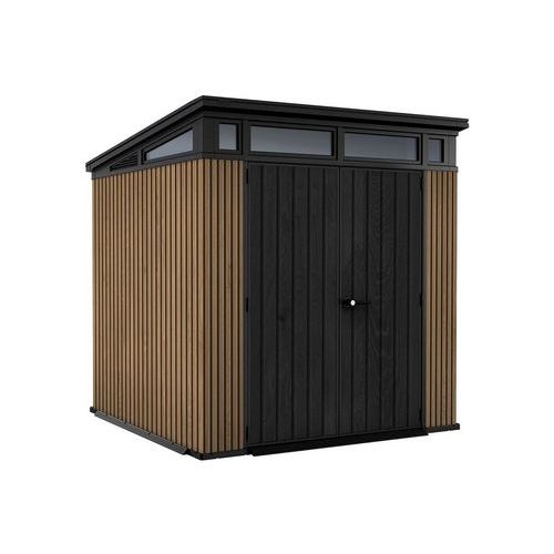 Bezúdržbový plastový zahradní domek Vertical v hnědém provedení je vyroben z jedinečného materiálu Decocoat, který je inspirován moderním vzhledem v imitaci dřeva.